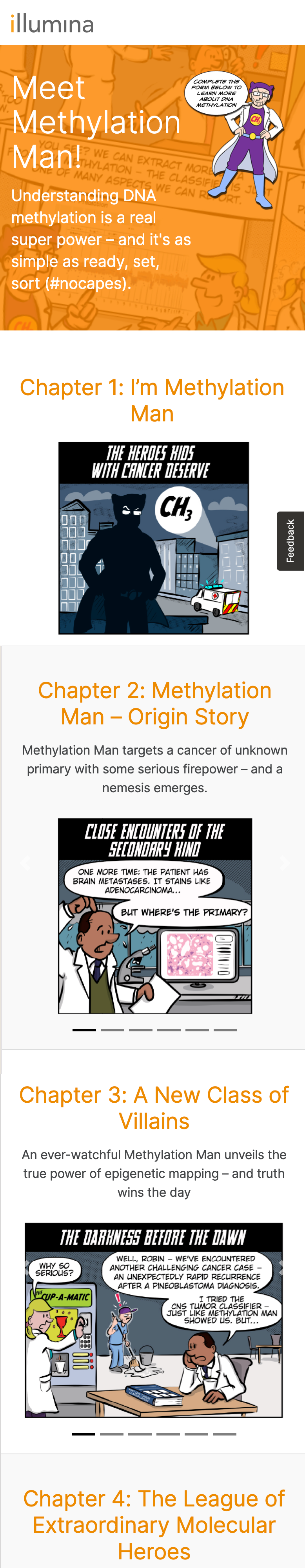 A series of comics were developed for Illumina’s methylation arrays. These were created as a set of static display ads that ran in The Pathologist.This project was an adaptation of these illustrations to a single web-based experience that adjusts from panel-to-panel for desktop, and frame-to-frame on mobile.